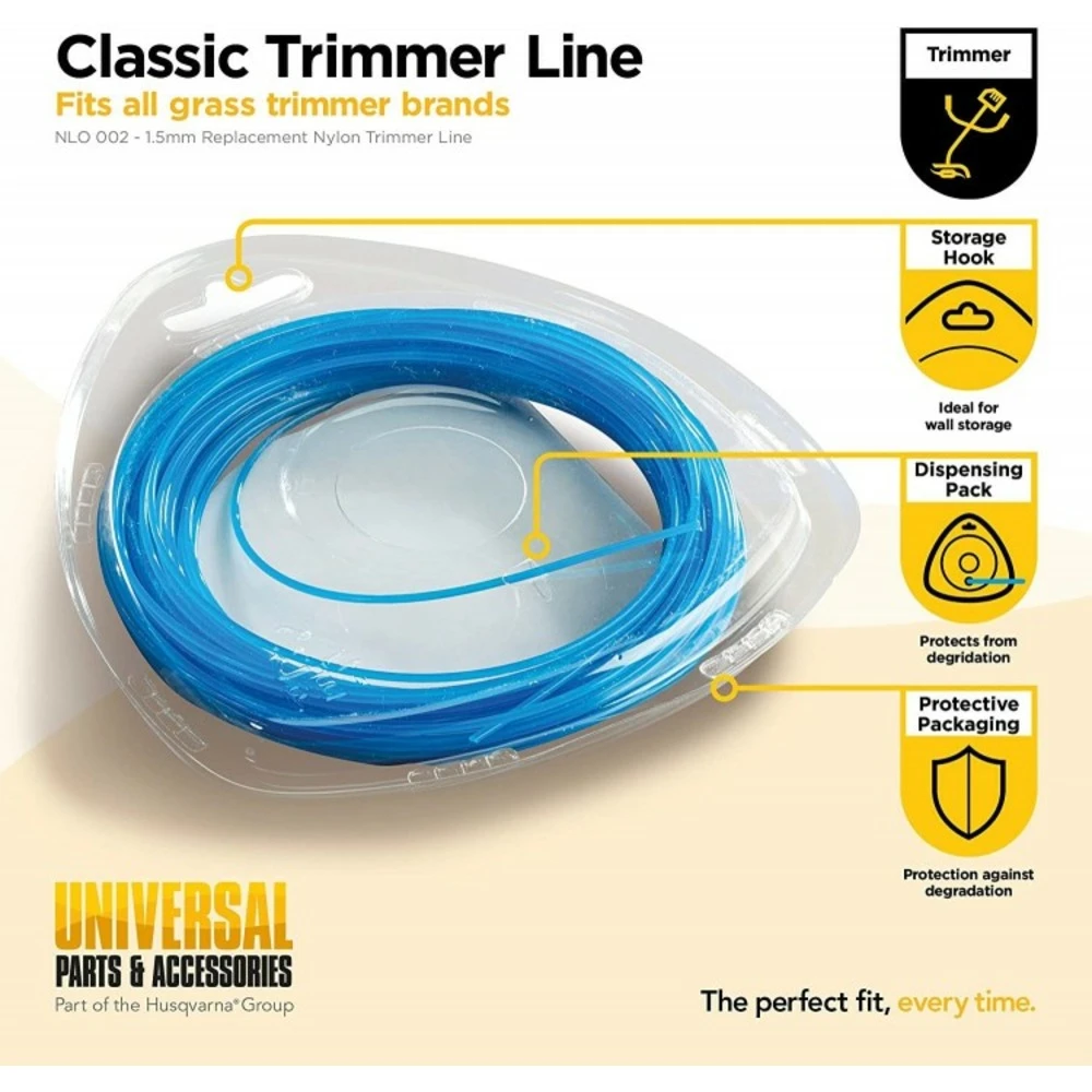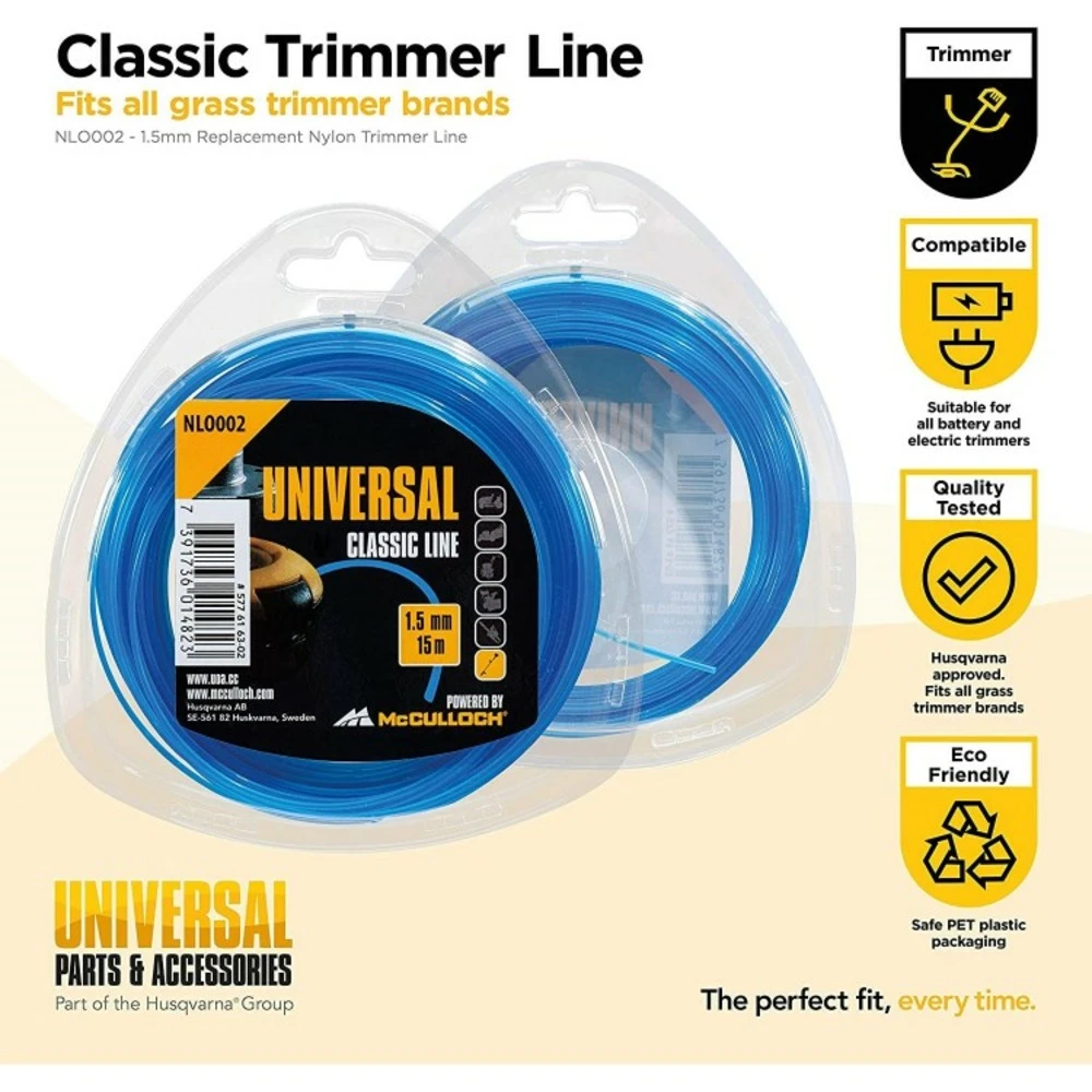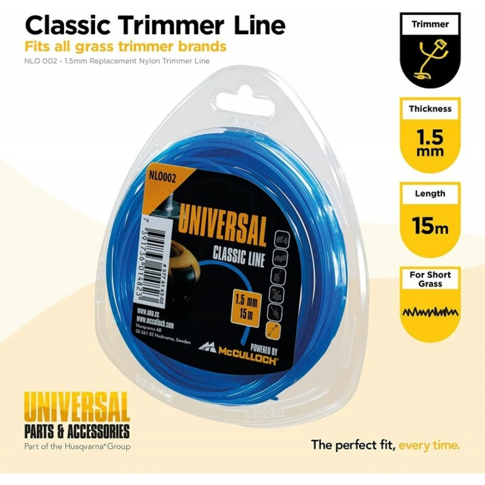 Ligne de coupe universal – accessoire d’origine de qualité mcculloch éprouvée : le fil de nylon universal est idéal pour tailler le gazon et les broussailles en toute tranquillité. Grâce à une technologie brevetée, les pousses, les chardons et même l’herbe dure sont coupés proprement et, surtout, sans bruit. Le fil de coupe est en nylon résistant et durable.fil nylon rond 1.5mm x 15m de la marque universalqualité mcculloch : la ligne de fauchage coupe l’herbe et les broussailles avec une précision maximale et assure une coupe nettedurabilité : le fil en nylon est résistant à la déchirure et peut être utilisé pendant longtempsfil de coupe de haute qualité : le fil a une longueur de 15 m