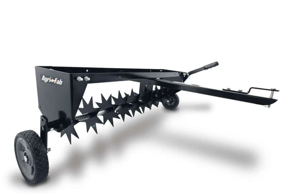 Aérateur tracté à dents jusqu’à 6 cm de travail en profondeur, avec roues de transport et levier pour passer de la position de transport à la position de travail. Angle de travail ajustable pour s’adapter à la plupart des autoportées avec capacité de remorquage. Largeur de travail 102 cm. 10 lames de 23 cm de diamètre.